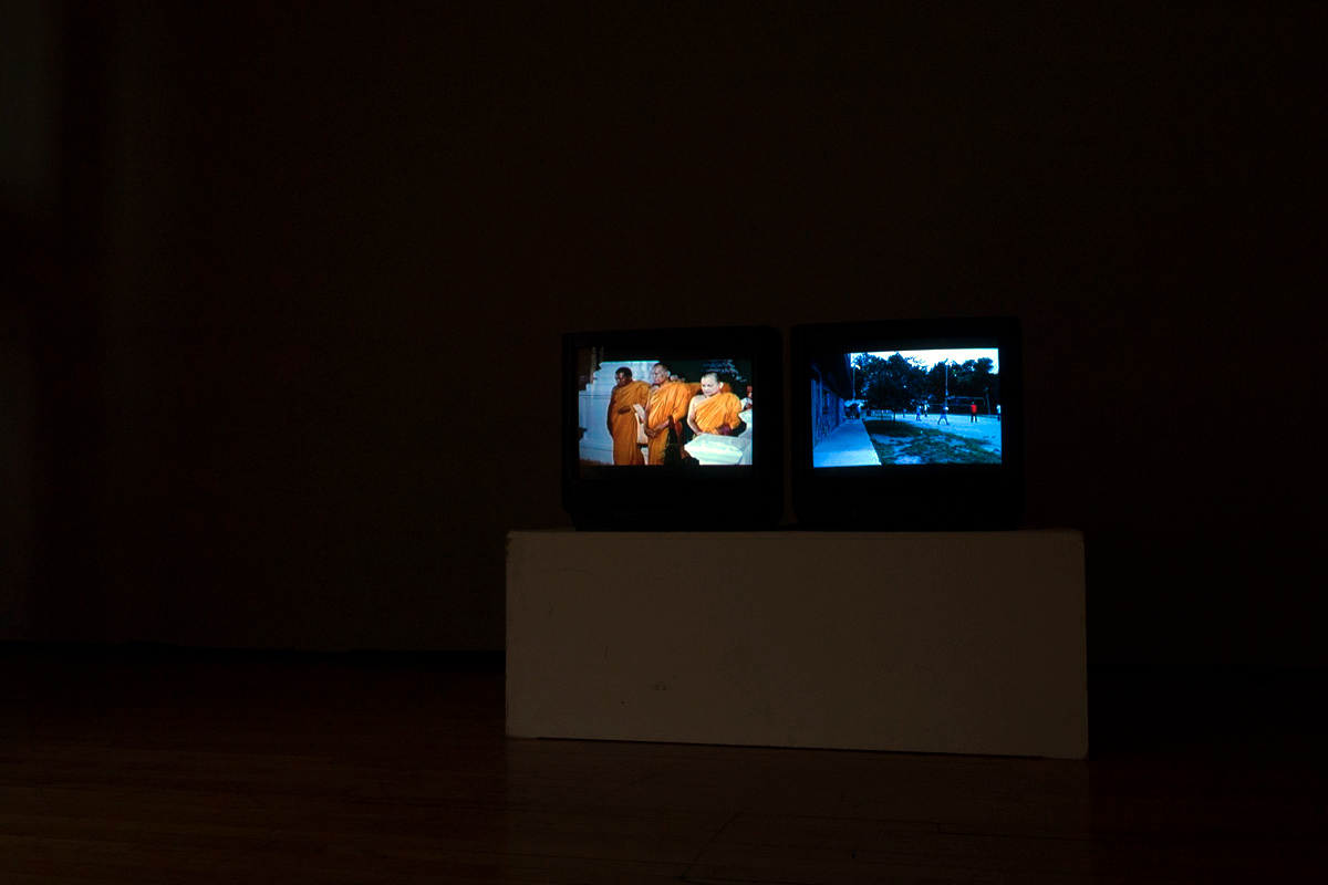 Idol/Idle, 2016. Two-channel video (color, sound; 15 minutes). Installation view, Massachusetts College of Art and Design. © Sopheak Sam